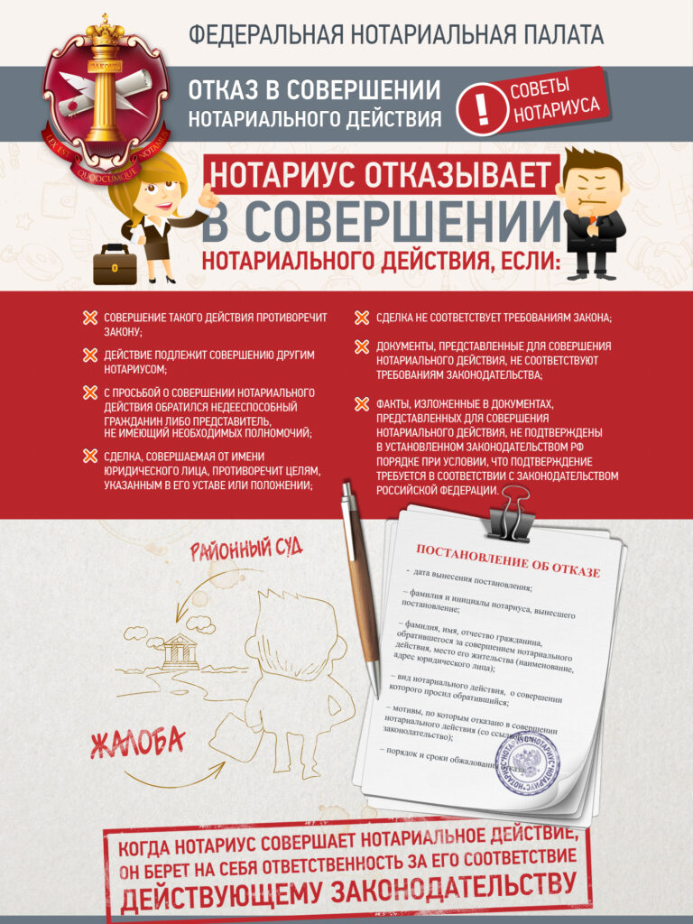 Когда нотариус совершает нотариальное действие, он берет на себя ответственность за его соответствие действующему законодательству. Нотариус имеет право отказать в совершении нотариального действия по основаниям, которые прописаны в статье 48 Основ законодательства Российской Федерации о нотариате.